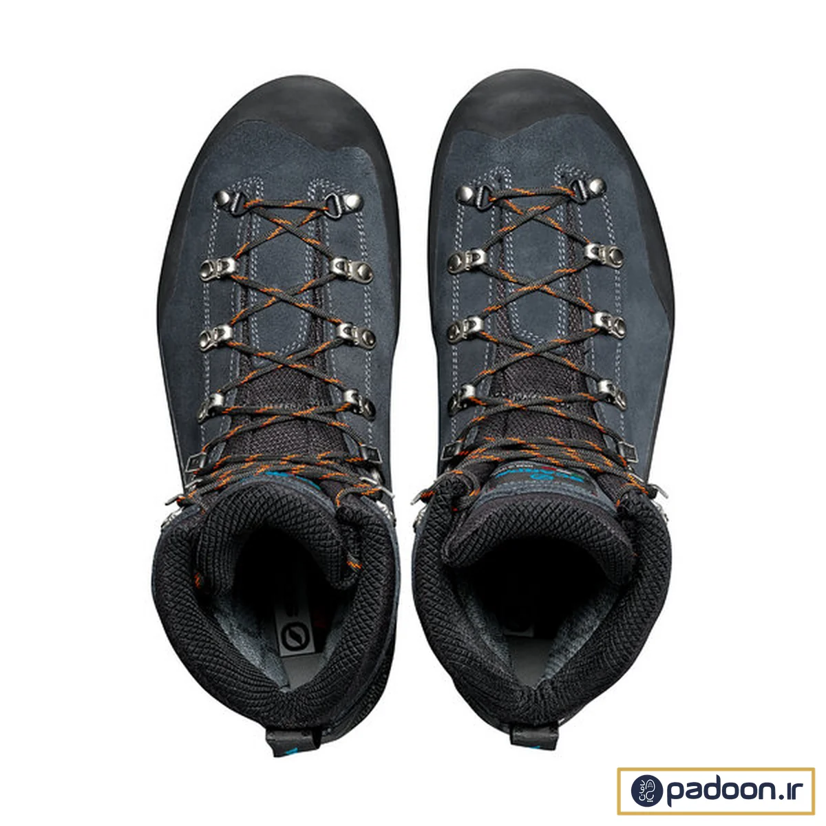 👟 رویه:چرم جیر Perwanger با ضخامت ۳ میلیمتر و مقاوم در برابر نفوذ آبدارای فناوری EXO SCARPA برای محافظت از مچ پا با لایهگذاری نرم و ساختار پشتیبانیکننده یقهی ارگونومیک از جنس پارچه کشی برای فیت کامل دور مچ